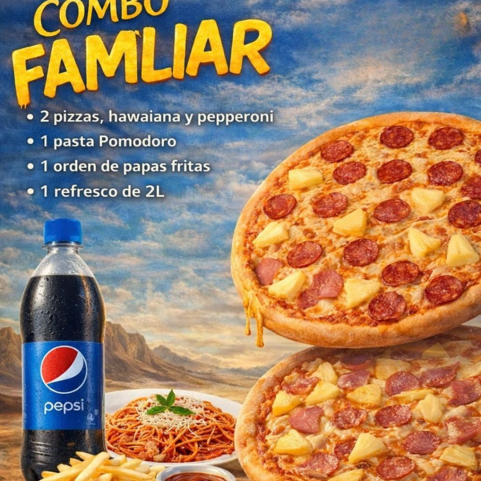 Pizza de Pepperoni*1 + Pizza Hawaiana*1 + Papas a La Francesa*1 + Pomodoro*1 + Pepsi 2 lts*1 (Manda mensaje para elegir sabor de pizza y de refresco)