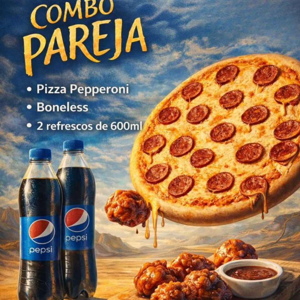 Pizza de Pepperoni*1 + Boneless*1 + Mirinda 600 ml*1 + Pepsi 600 ml*1 Si quieres cambiar de refresco o sabor de boneless, mándanos un mensajito!