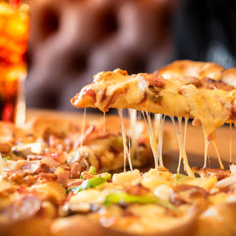 Deliciosa pizza, base con especias, salsa contadina, mezcla de quesos, jalapeños, tocino, chorizo, frijoles y cebolla morada.