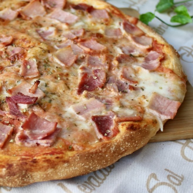 Base especiada, salsa contadina, mezcla de quesos y jamón de pierna
