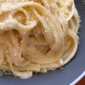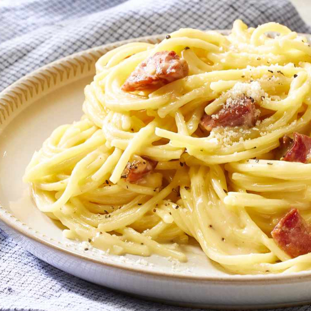 Pasta en salsa cremosa con tocino y ajo espolvoreada con queso parmesano