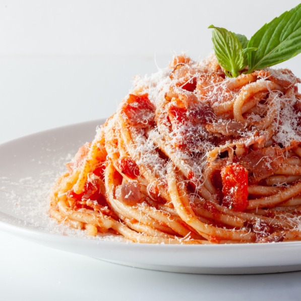 Pasta ensalsa de tomate especiada y espolvoreada con queso parmesano.