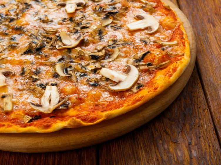 Deliciosa pizza, base con especias ,salsa contadina, mezcla de quesos, jamón y champiñones