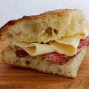 Pan focaccia artesanal aderezado con mayonesa chipotle, pesto, jamón, salami, pepperoni y quesos con ensalada.