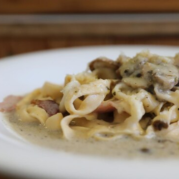 Salsa cremosa con jamón y champiñones espolvoreada con queso parmesano.