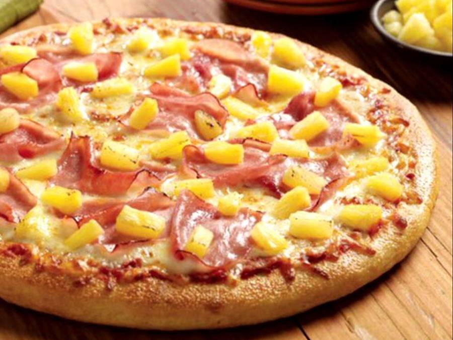 Deliciosa pizza, base con especias, salsa contadina, mezcla de quesos, jamón y piña natural.