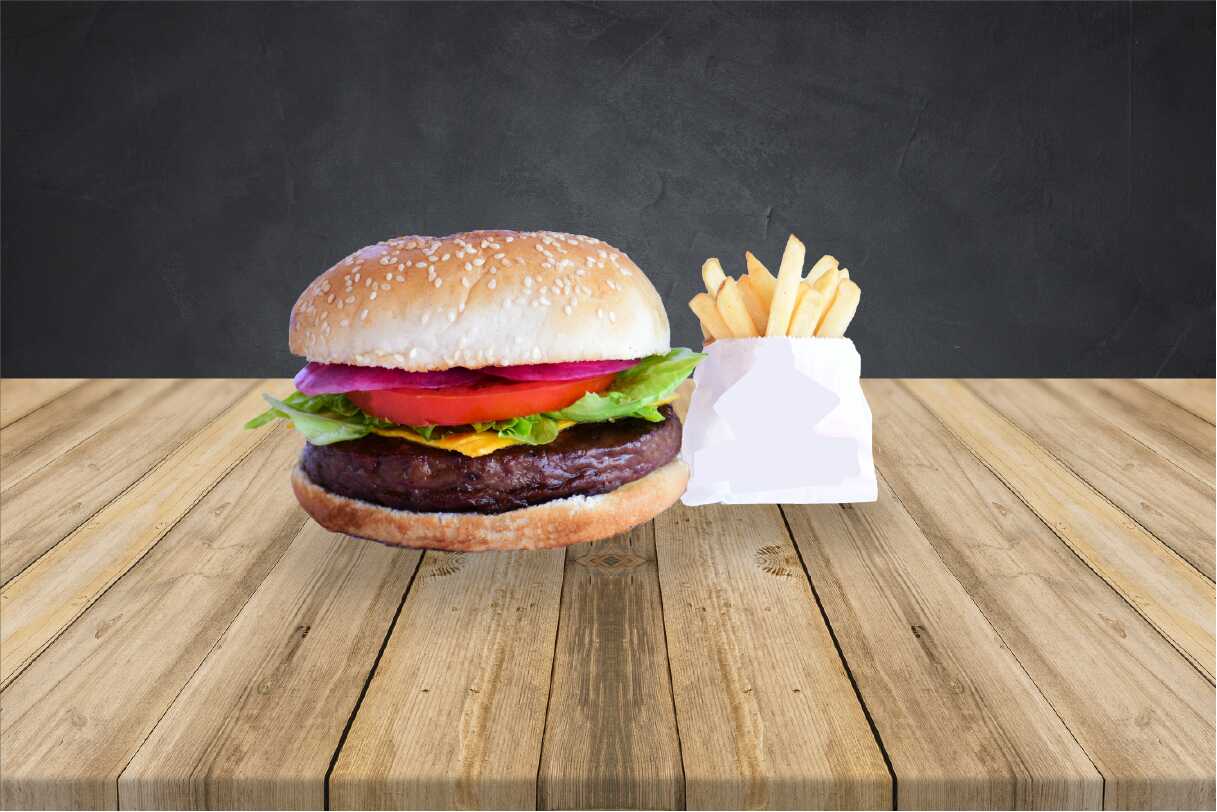 Hamburguesa de res acompañada con una porción de papas