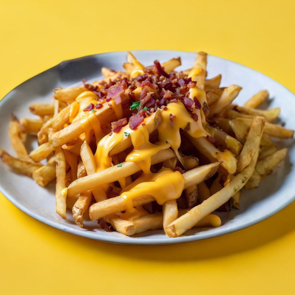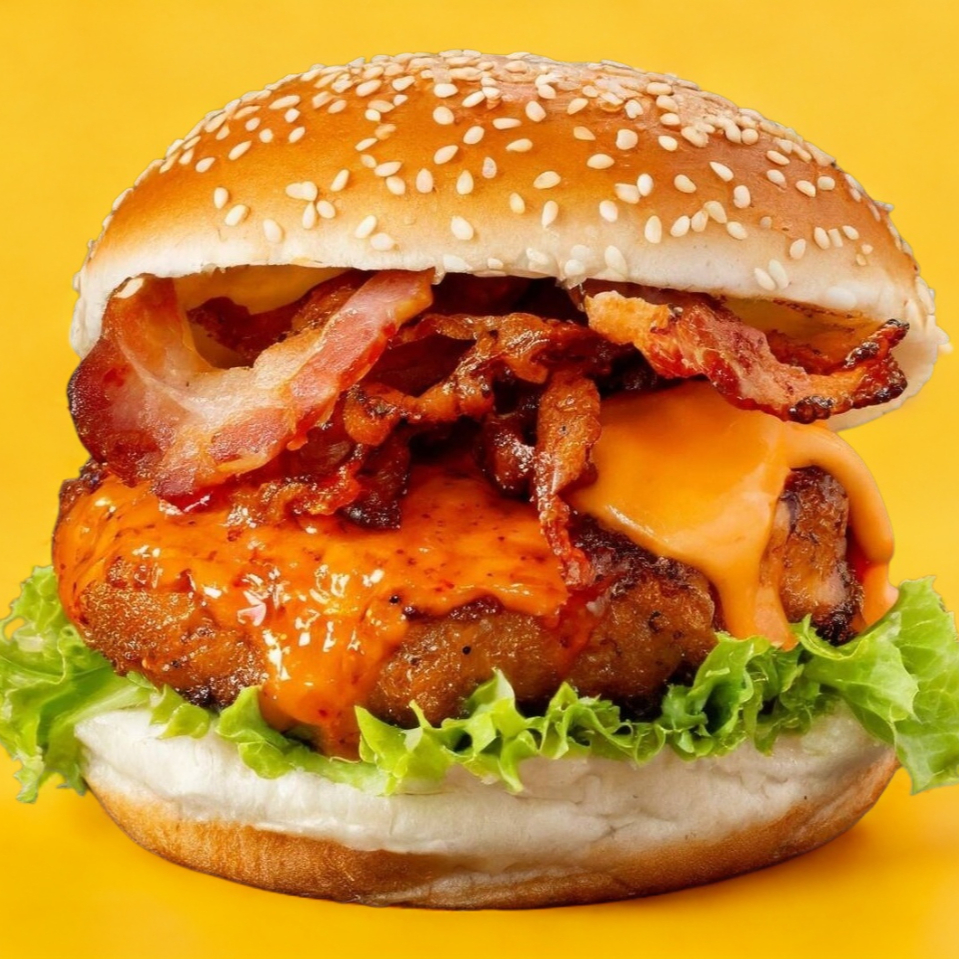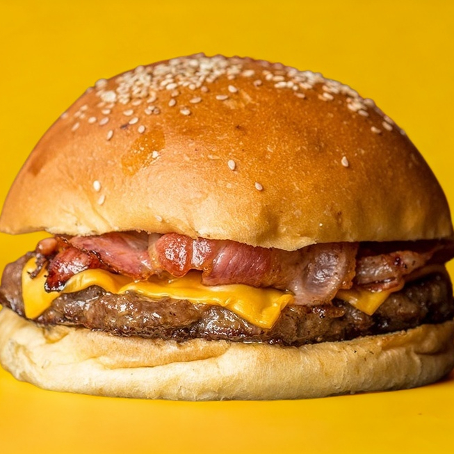 Carne de res, tocino, doble porción de queso amarillo y aderezo de la casa acompañado de papas.
