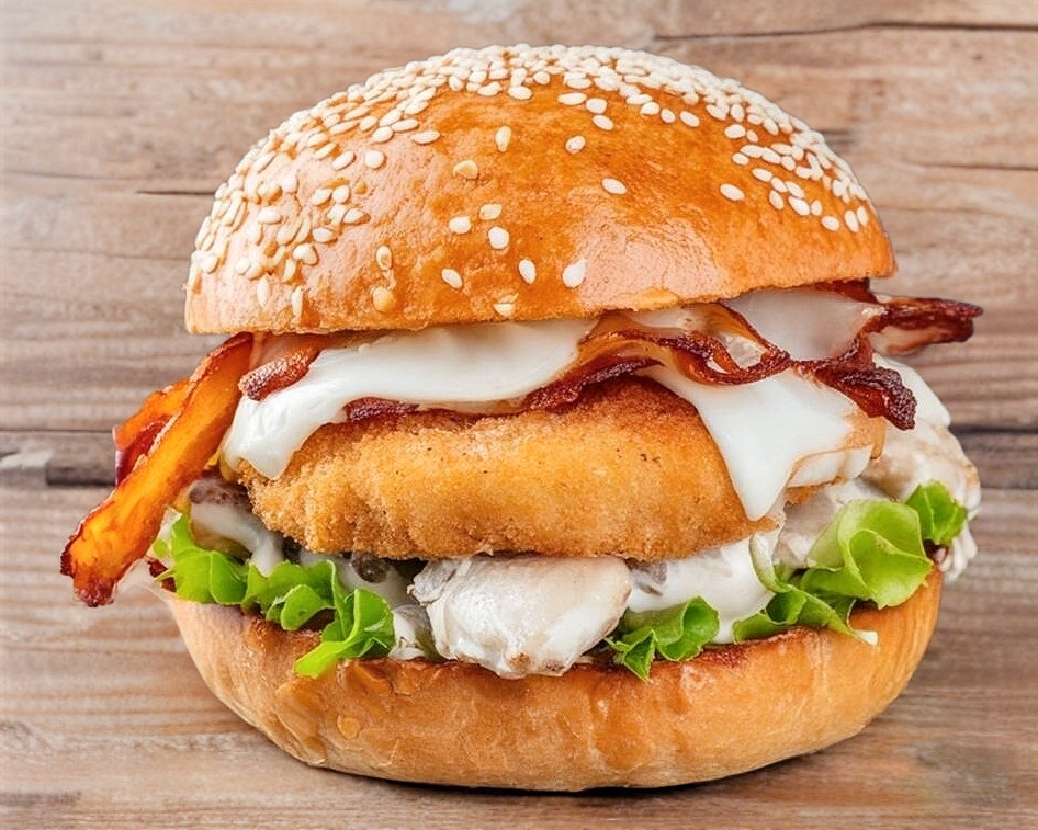 Lechuga, cebolla asada, jitomate, pollo empanizado, queso manchego, tocino, champiñones, queso crema de la casa.