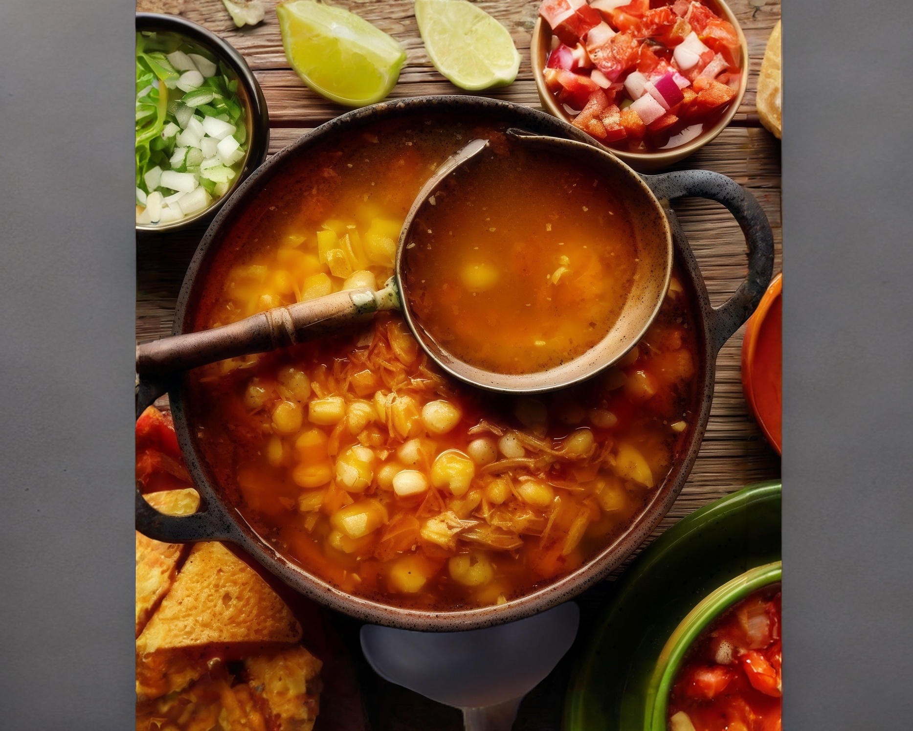 Pozole de carne de cerdo con maiz pozolero, servido en caldo tradicinal receta estilo Aguascalientes, acompañado de salsa, verdura, limon y tostadas