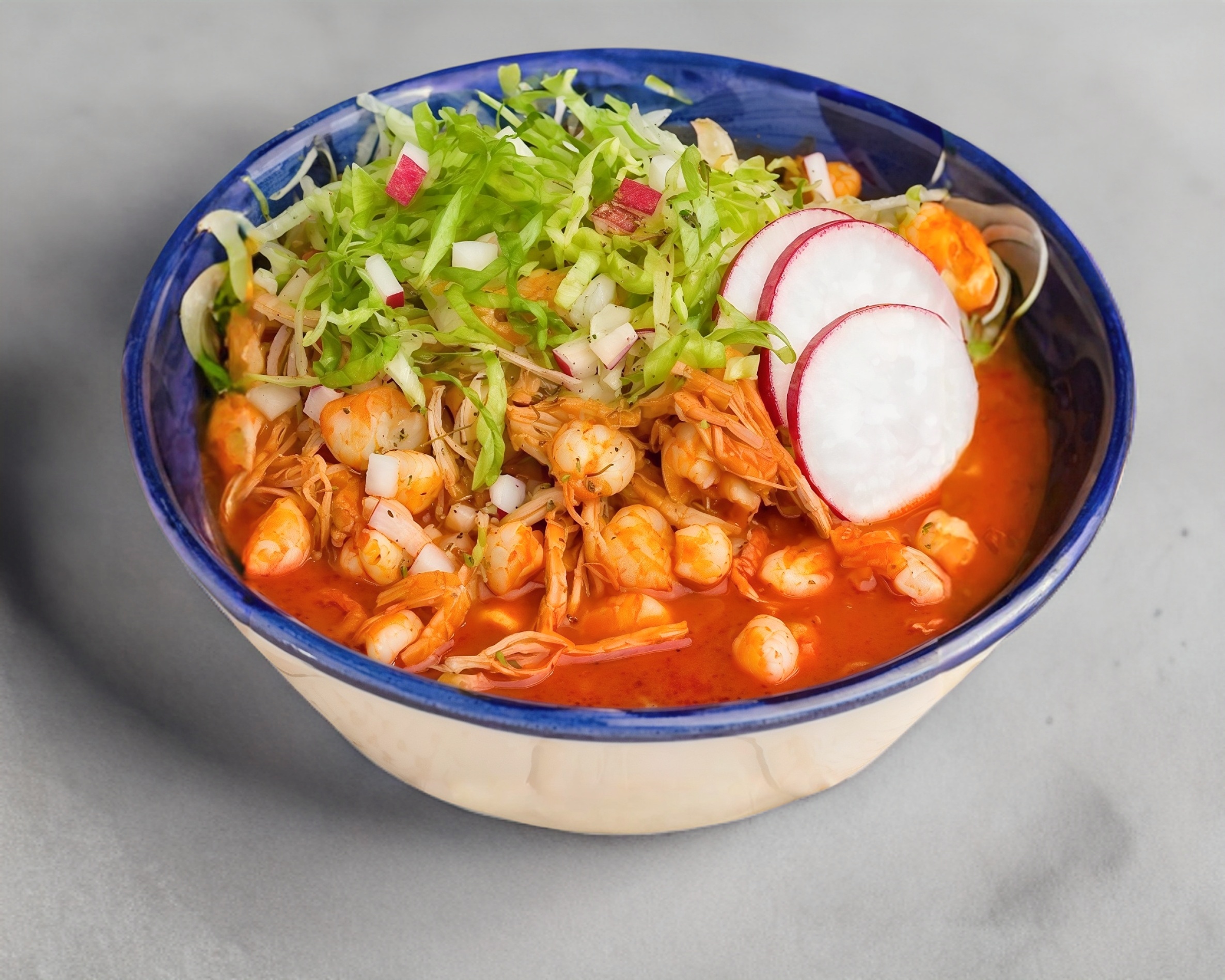 Pozole de carne de cerdo y pollo, con maiz pozolero, servido en caldo tradicinal receta estilo Aguascalientes acompañado de salsa, verdura, limon y tostadas