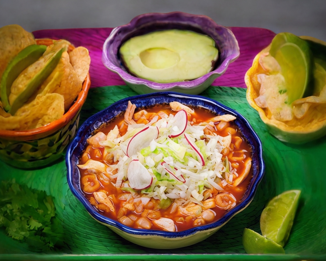 Pozole carne de cerdo con maíz pozolero, servido en caldo tradicional receta estilo aguascalientes, acompañado de salsa, verdura, limón y tostadas.