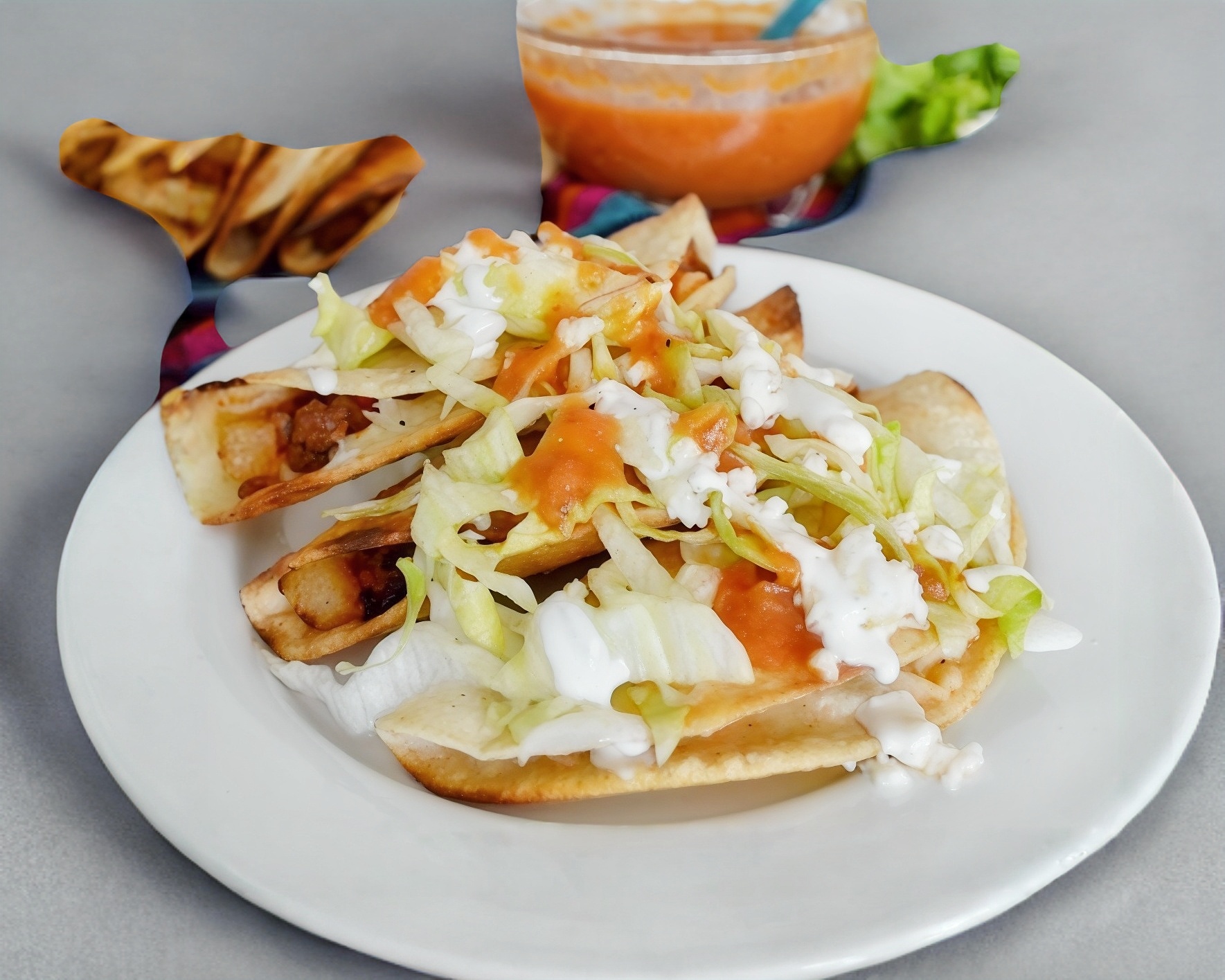 4 tacos de papa acompañados de salsa de tomate con oregano, verduras, limon y crema