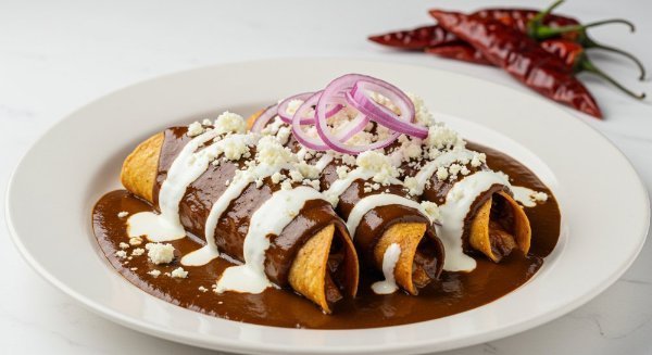 Orden de tres enchiladas rellenas de pollo deshebrado, bañadas en salsa de mole, acompañadas de queso, crema y cebolla morada.
