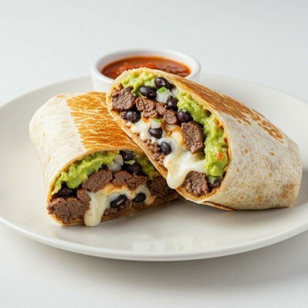 Tortilla de harina rellena de arrachera, queso mozzarella, frijoles, arroz blanco, guacamole y salsa de la casa.