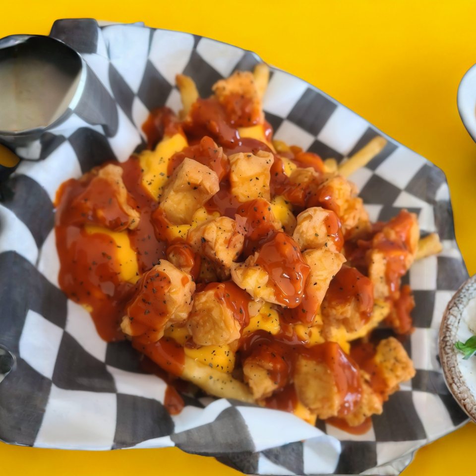 300 framos de papas a la francesa sazonadas con Lemon Pepper y bañadas con queso amarillo, aderezo ranch y la salsa de tu eleccion + 300 gramos de MiniBoneless