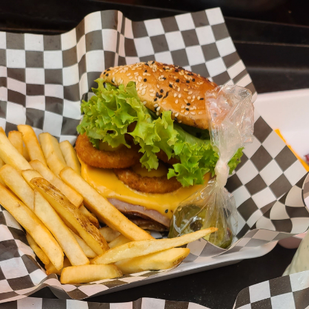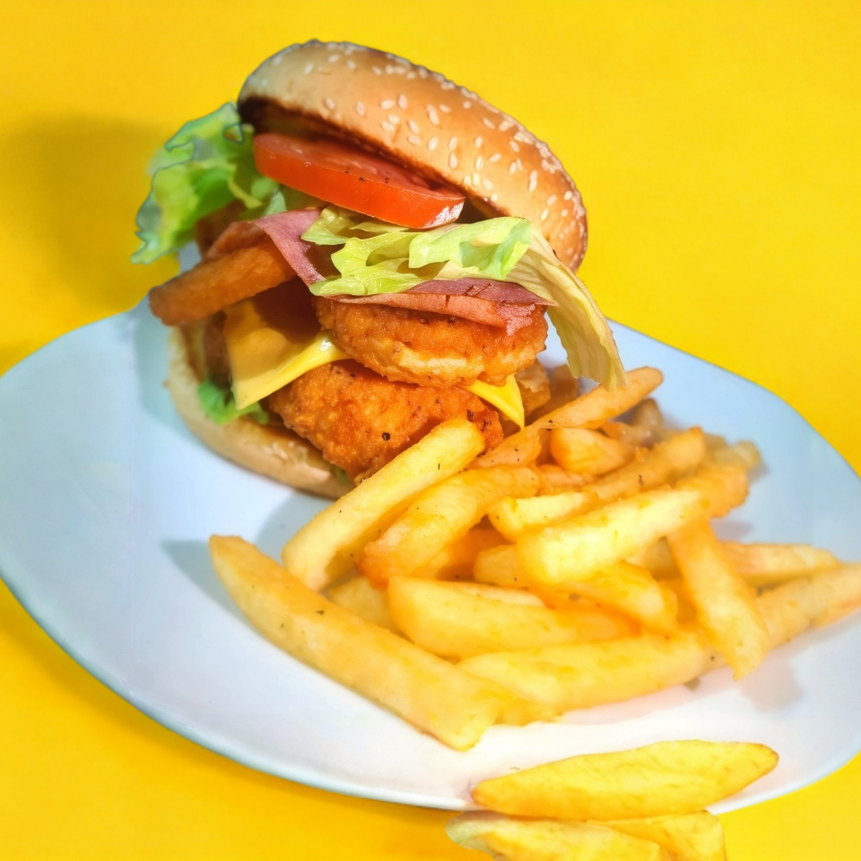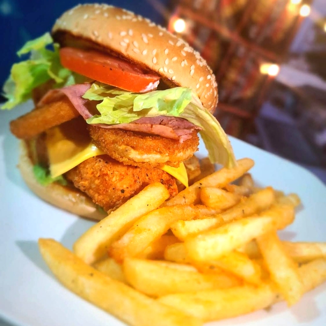 Hamburhuesa 100% pechuga de pollo preparada con aros de cebolla, doble queso amarillo, jamon, aguacate y verdura + 200 gramos de papas a la francesa + 1 refresco