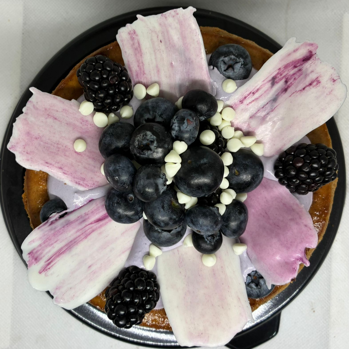 140gr de proteina, relleno con zarzamora, mora azul y decotrado con moras y petalos de chocolate blanco