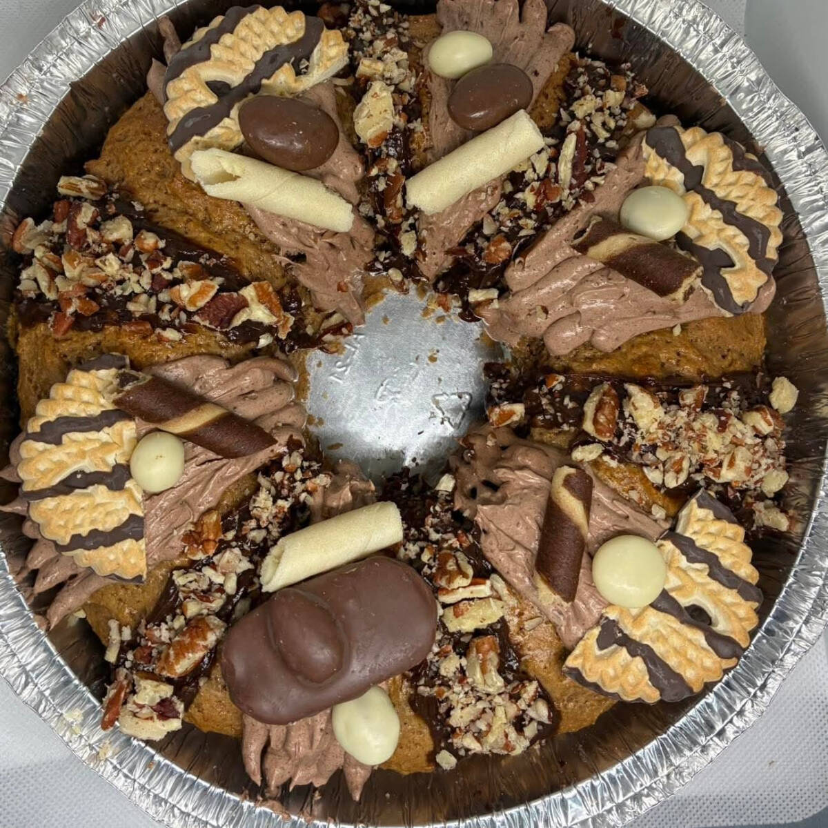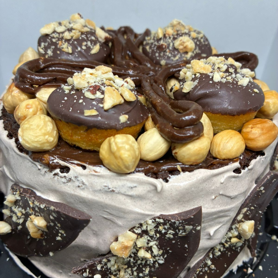 100gr de proteina, pan de chocolate, relleno de betun de chocolate, cubierto con ganache, nuez y crema de avellanas topeado con chocolates y galletas, contiene 2 muñequitos, rinde de 6 a 8 personas.