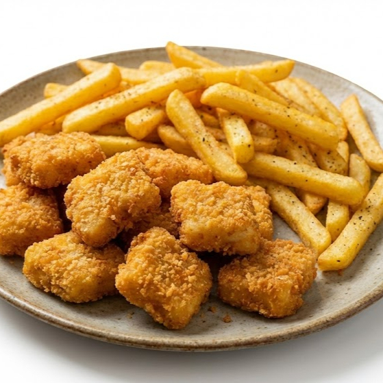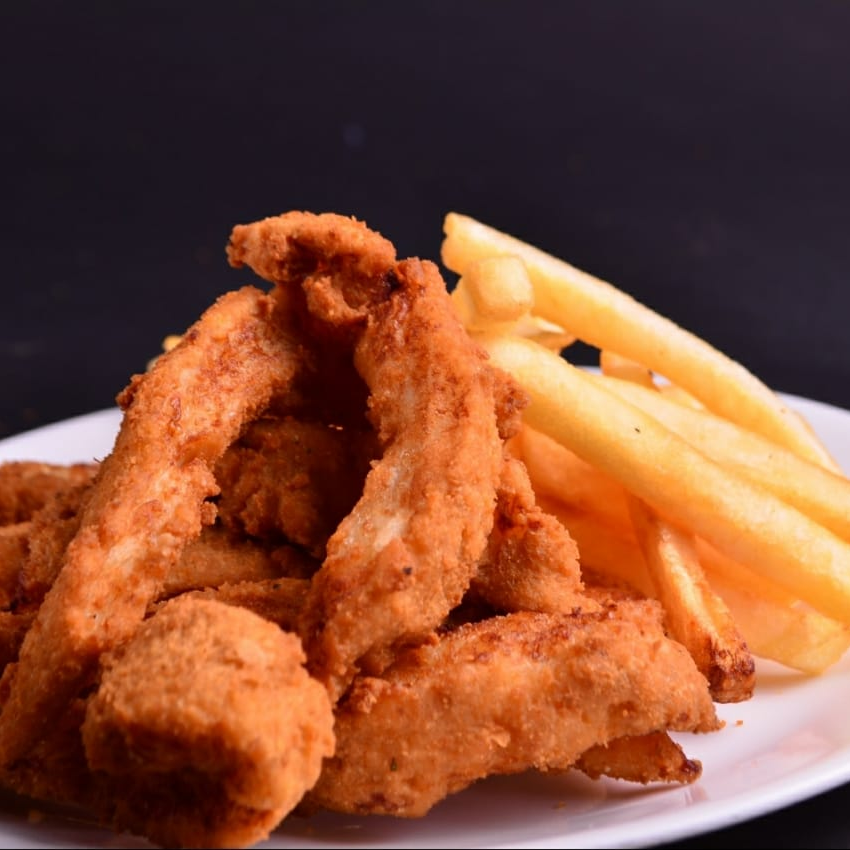 Tiras de pecado empanizado, acompañadas de papas a la francesa.