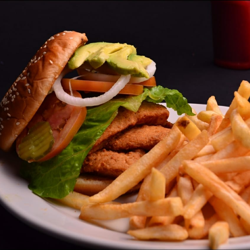 Hamburguesa de pescado con aguacate, lechuga, jitomate, cebolla y acompañada de papas a la francesa.