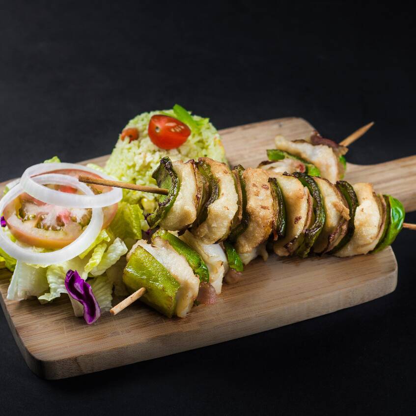 Brocheta de pescado con salsa a tu elección.