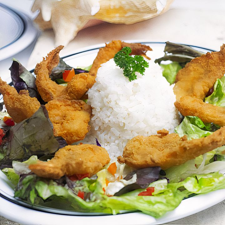 Camarones empanizados con ración de arroz y ración de ensalada.