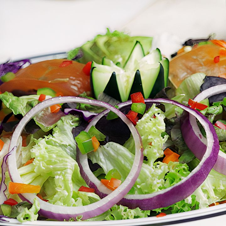 Ensalada fresca de lechuga, tomate, col, zanahoria y cebolla.