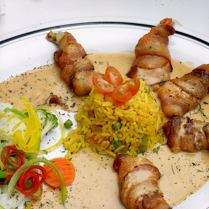Camarones rellenos con tocino, salsa de chipotle, acompañado de verduras al vapor o ensalada verde y arroz.