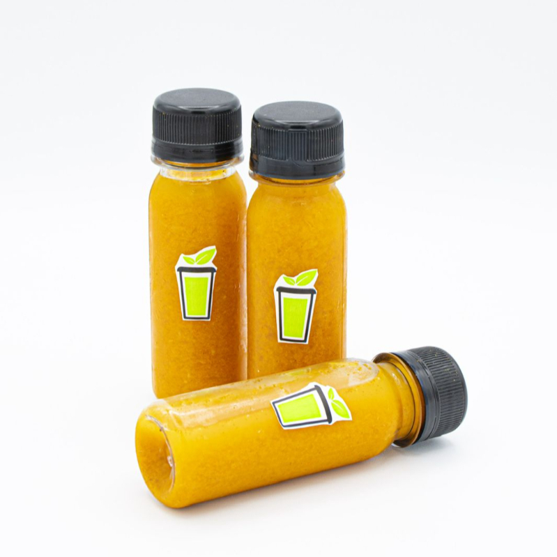 El concentrado de energía, raíz de jengibre, jugo de naranja, jugo de limón, cúrcuma y pimienta cayena, ideal para un golpe de vitalidad.