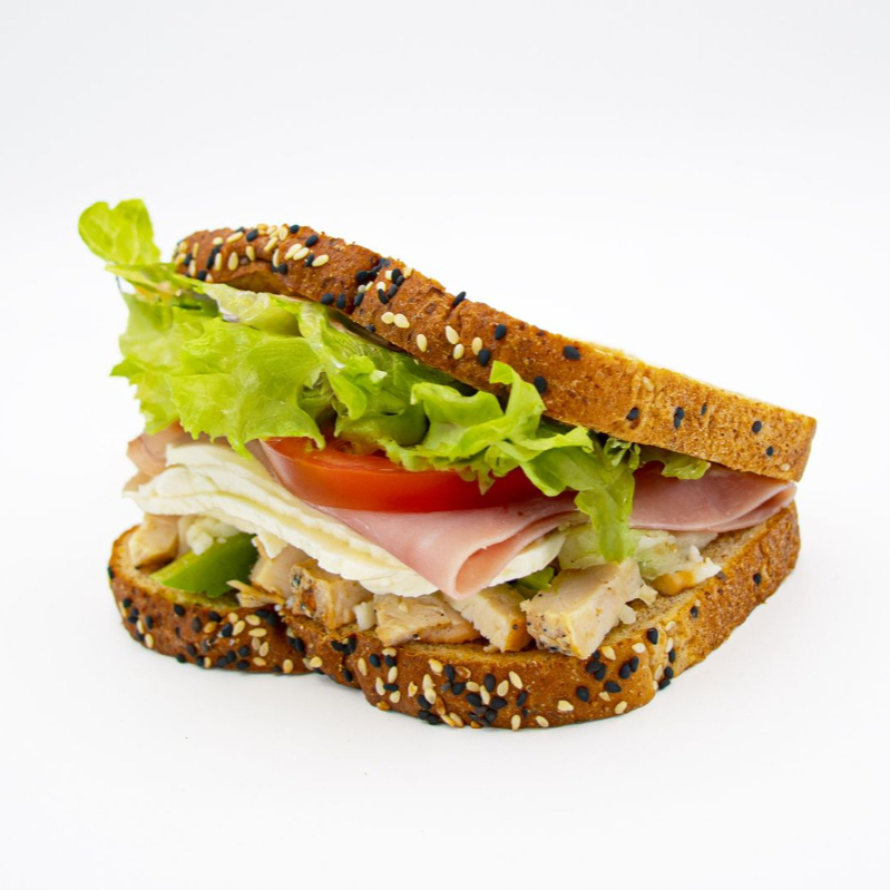 Jamón de pavo, pollo a la plancha y mozzarella, dos rebanadas de pan, lechuga, espinaca, tomate, pimiento y chipotle.