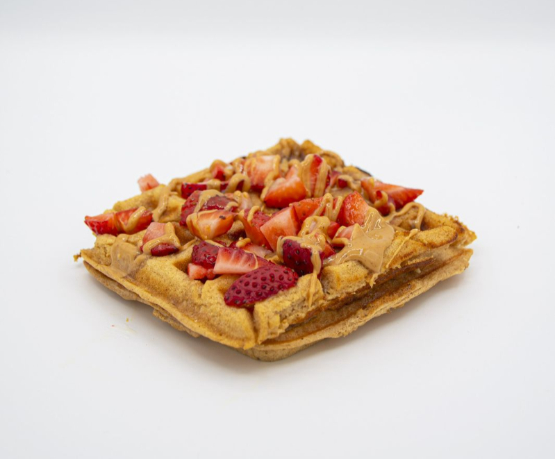 Waffle de harina kodiak, crema de cacahuate sugar free, miel y fresa, plátano.