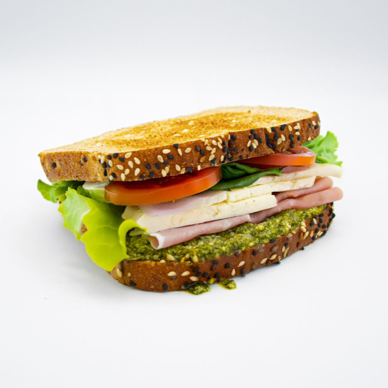 Pesto, jamón de pavo y queso panela, dos rebanadas de pan, lechuga, espinaca, tomate, pimiento y chipotle.