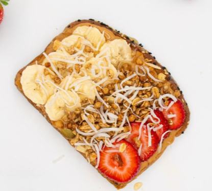 Fresa, plátano, crema de cacahuate o almendras sugar free, miel, coco, granola.