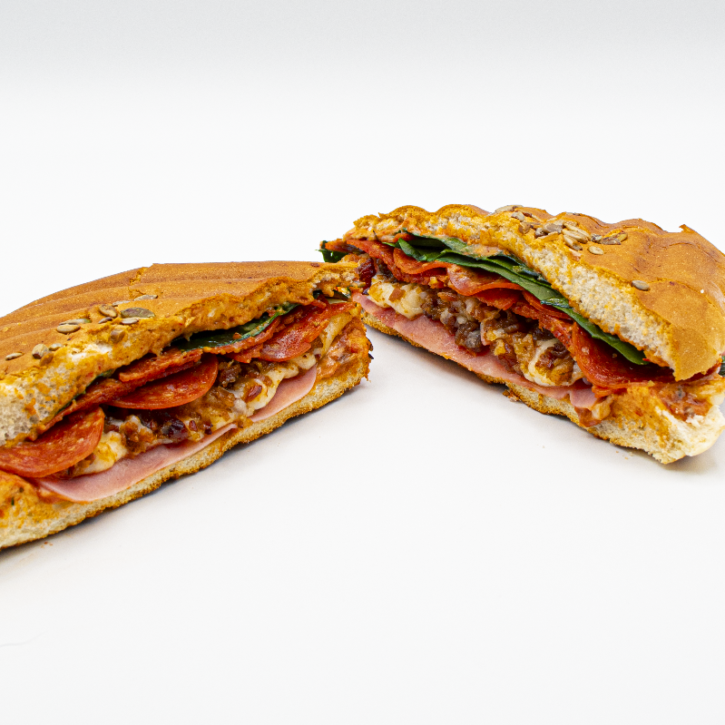 Jamón, pepperoni y tocino con mozzarella, dos rebanadas de pan, lechuga, espinaca, tomate, pimiento y chipotle.