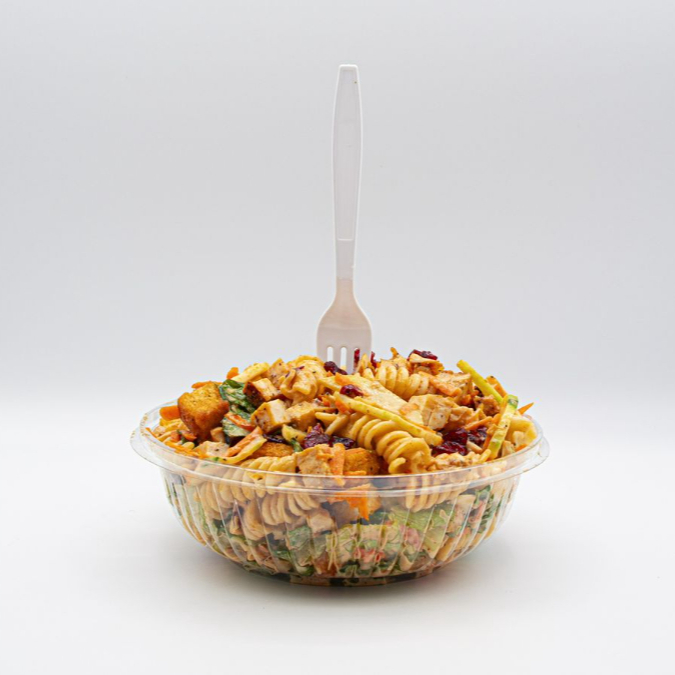 100 gr de pechuga de pollo a la plancha + lechuga orejona + pimientos + zanahoria + pepino + pasta de tornillo + arándanos + aderezo chipotle