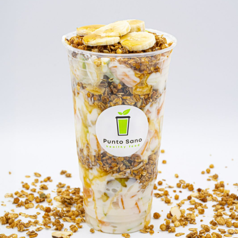 Todos llevan manzana, melón, pera, miel y granola y plátano súper completo y nutritivo.