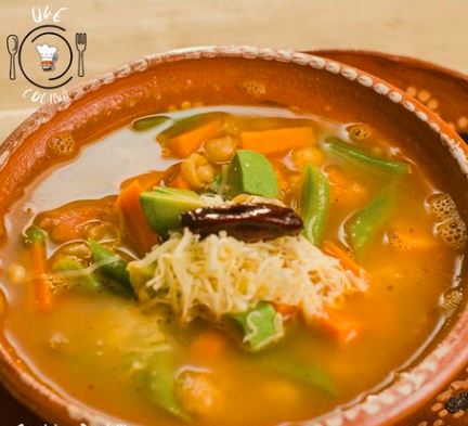 Tradicional caldo tlalpeño con aguacate, chipotle, queso, pollo, verduras.
