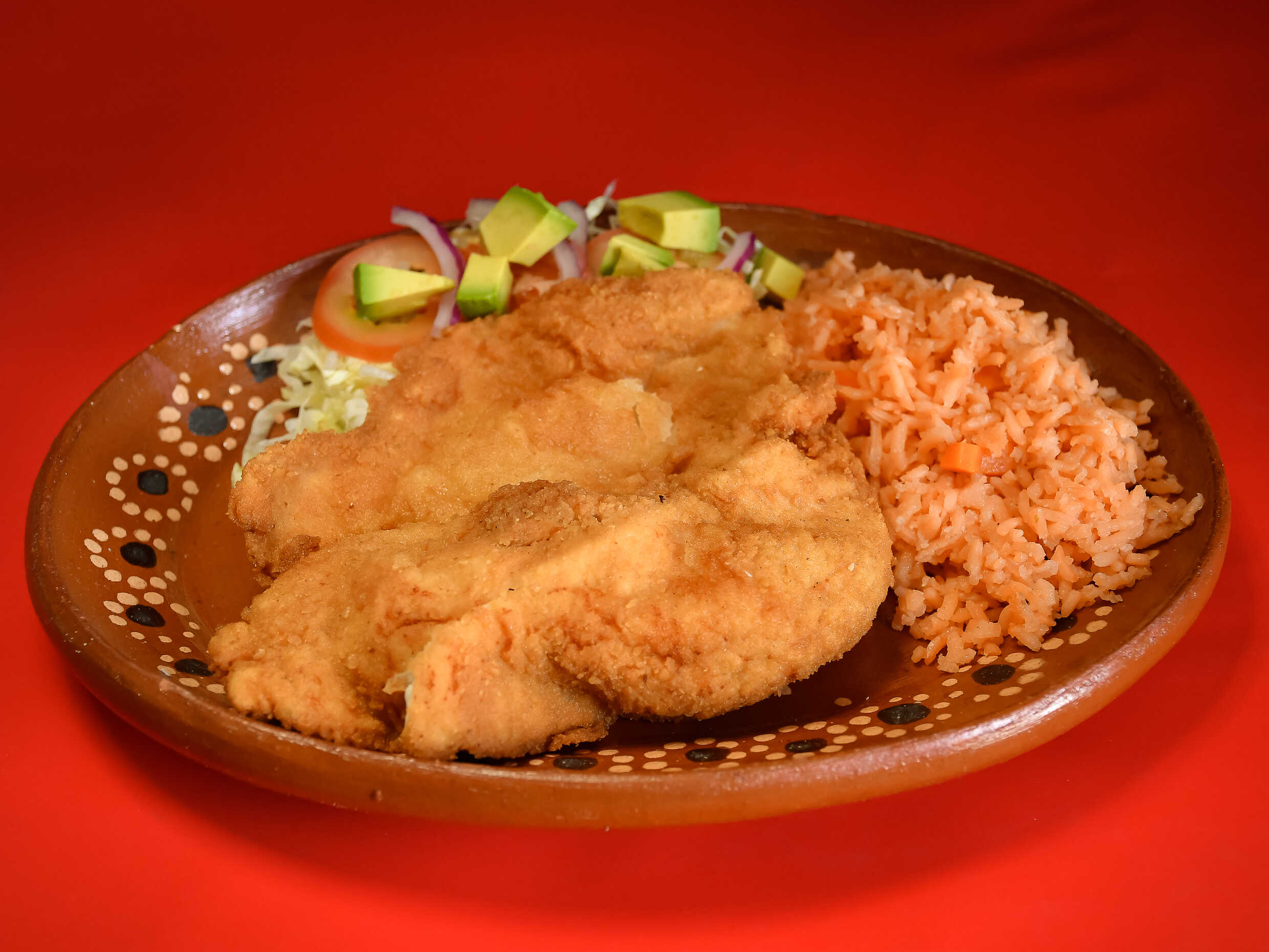 Platillo individual; Milanesa de pollo empanizada, acompañada de arroz y ensalada verde, con tortillas de maíz y salsa