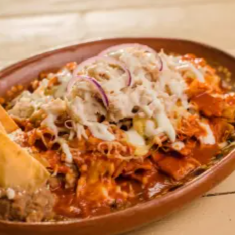 Chilaquiles en salsa roja con pollo y queso gratinado, guarnición de frijoles.
