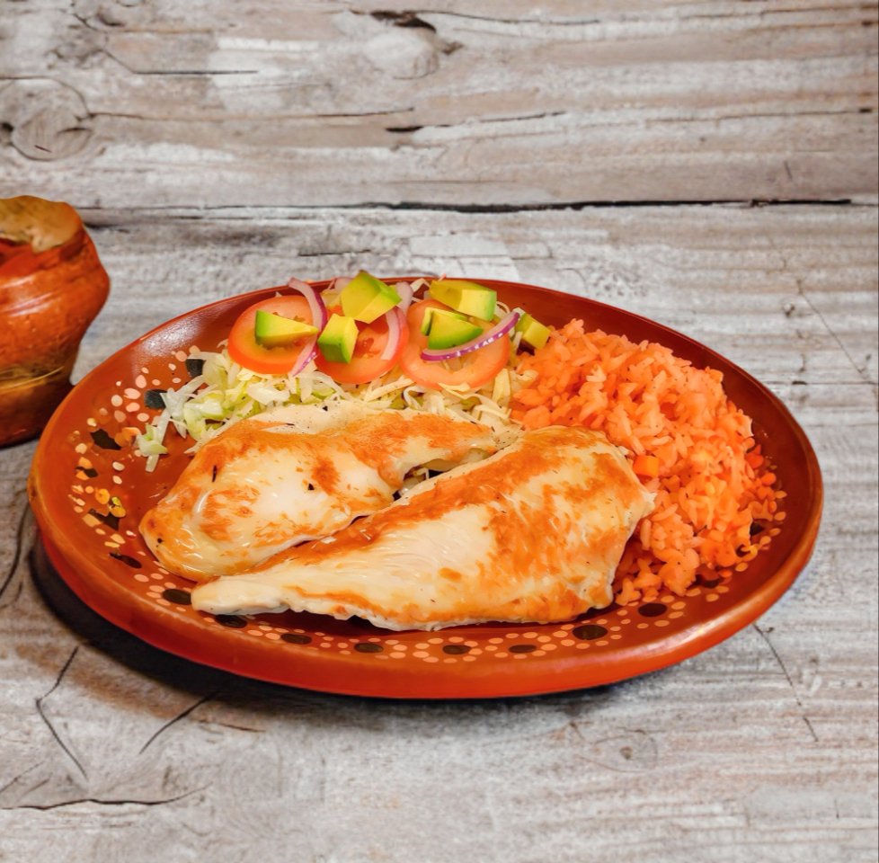 Pechuga de pollo a la parrilla con finas hierbas, brócoli y nopales asados, guarnición de arroz y ensalada de lechuga.