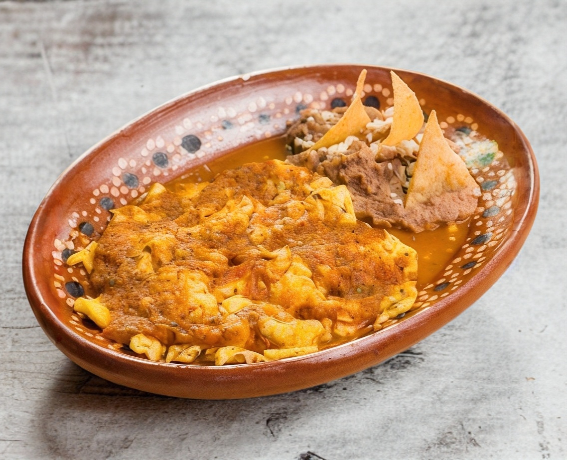 Chilaquiles en salsa roja con pollo y queso gratinado, guarnición de frijoles.