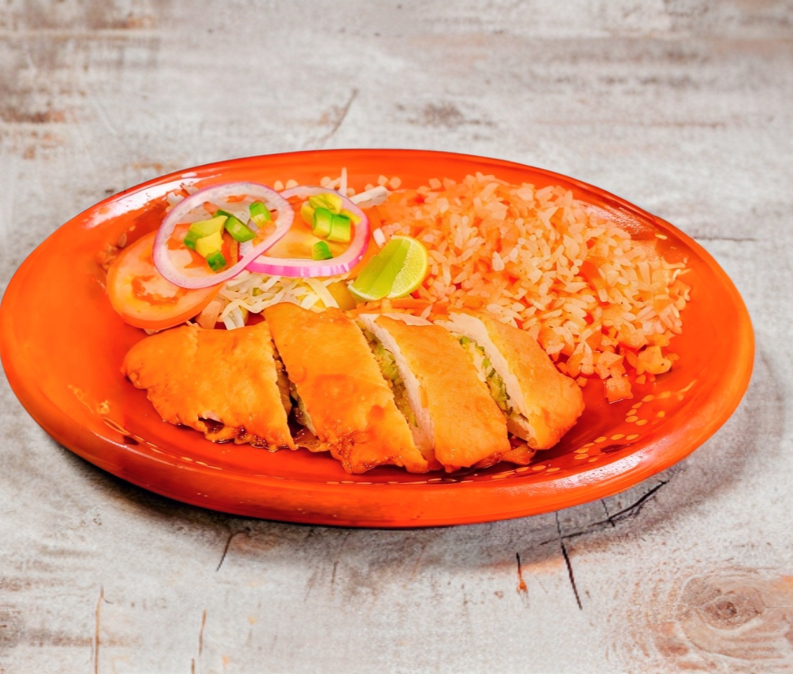 4 Dobladas rellenas de pechuga de pollo y bañadas con mole poblano, guarnición de arroz.