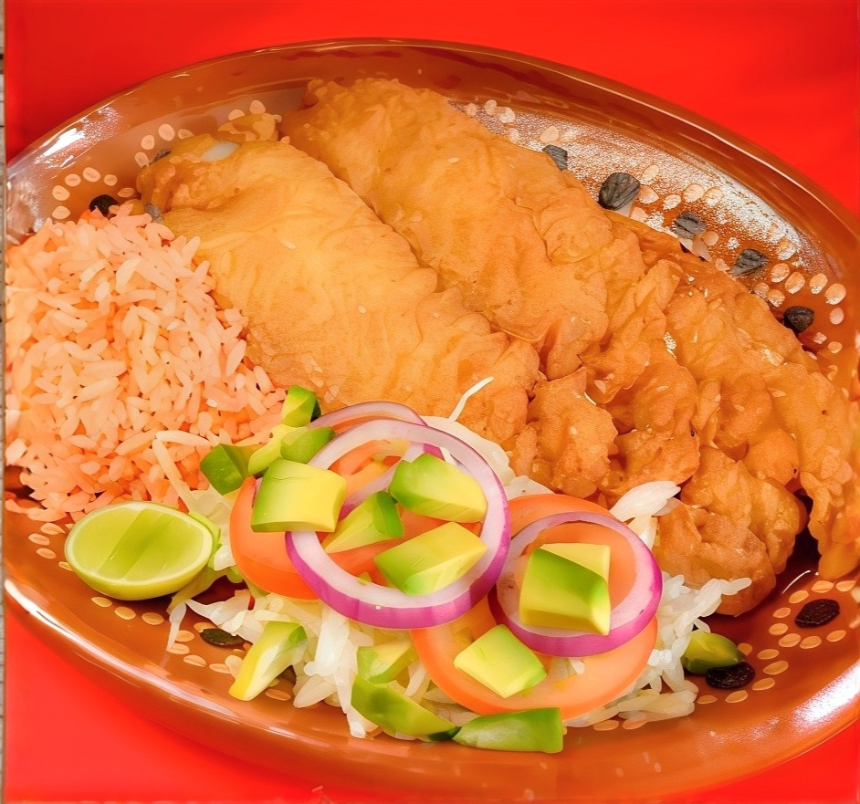 Filete de pescado empanizado con guarnición de ensalada de lechuga y arroz.