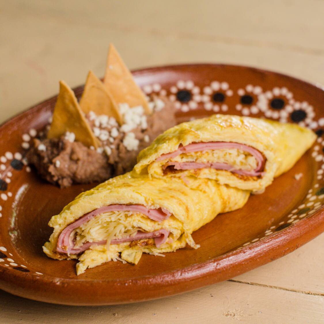 Omelette relleno de jamón y queso, acompañado de frijoles y tortillas.