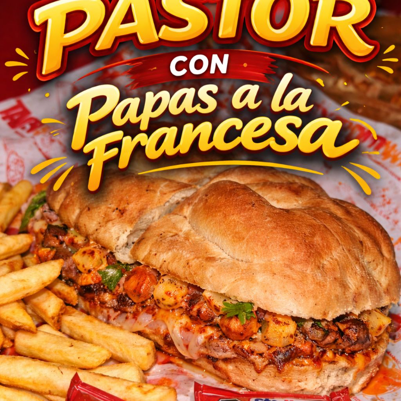 Torta de pastor en pan frances grande con jamon, queso amarillo, queso de puerco, lechuga, tomate, cebolla, aguacate, aderezos y acompañada de papas fritas super crujientes.