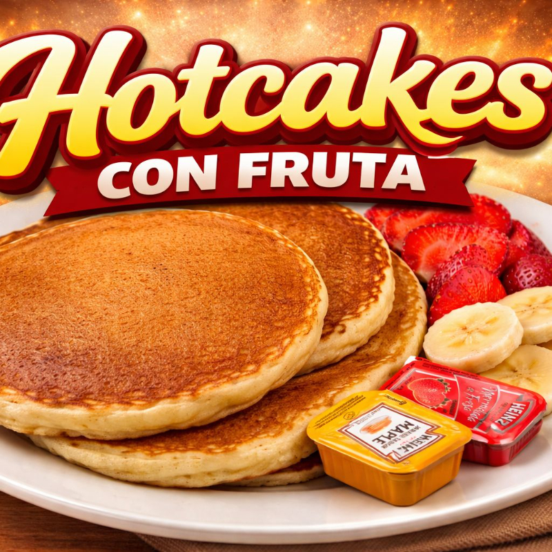 Hotcakes Tipo americano acompañados de fruta de temporada, miel de maple y mermelada