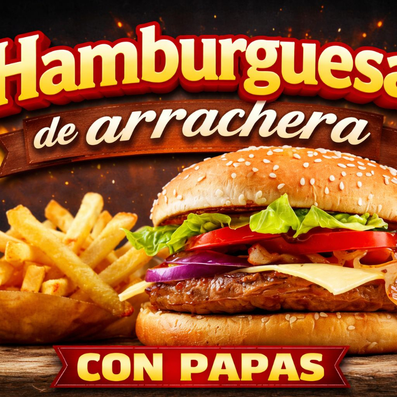 Hamburguesa de Arrachera con jamon, queso manchego, lechuga,tomate, cebolla, aguacate, aderezos y acompañada de papas fritas super crujientes