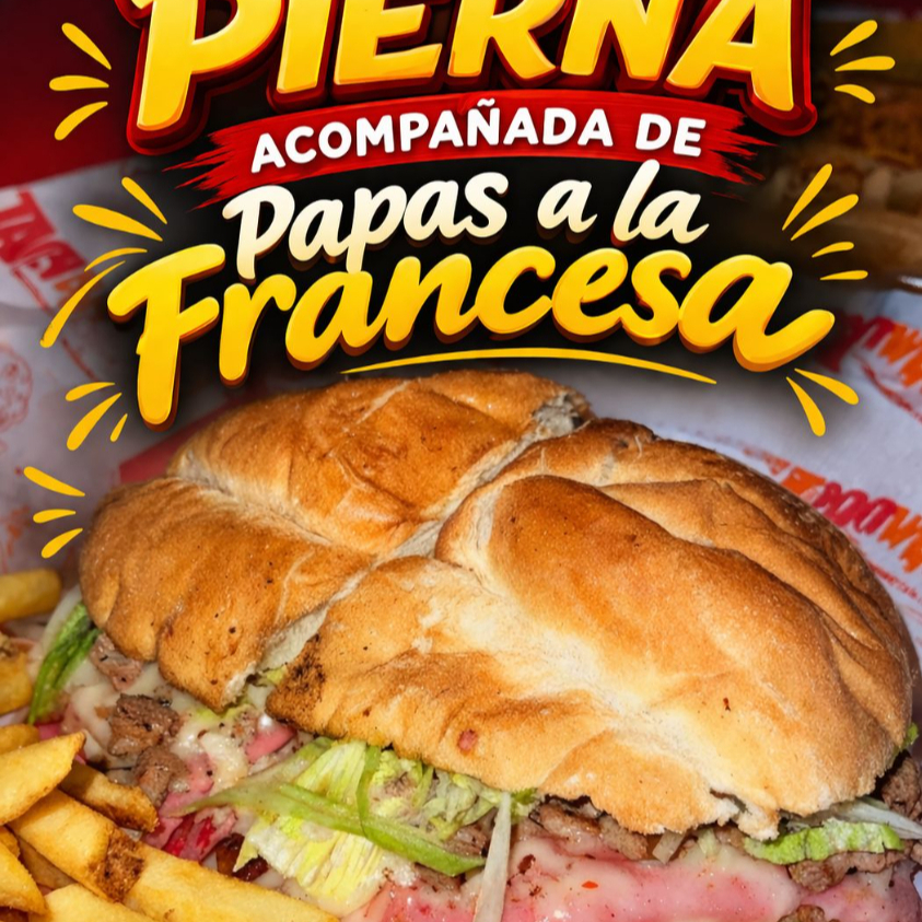 Torta de pierna en pan frances grande con jamon, queso amarillo, queso de puerco, lechuga, tomate, cebolla, aguacate, aderezos y acompañada de papas fritas super crujientes.