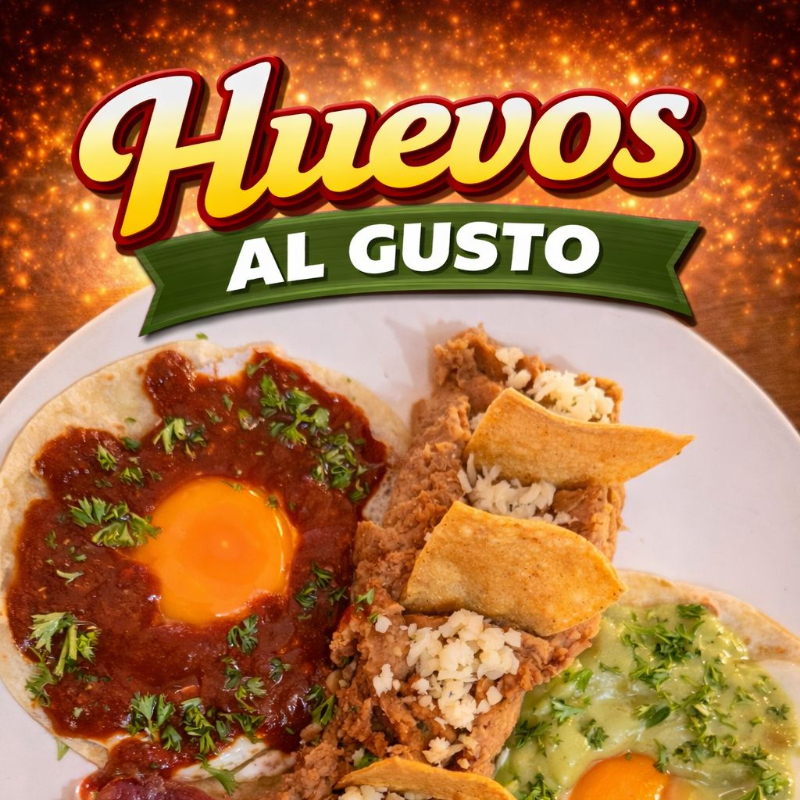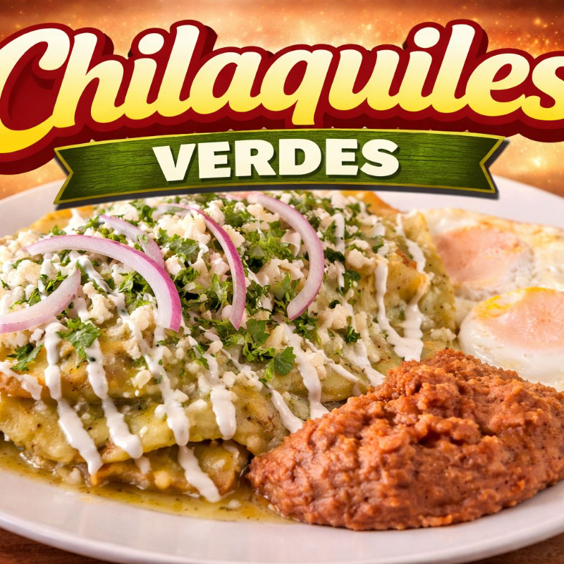 Chilaquiles rellenos de queso, acompañados de huevito estrellado, queso, crema, aguacate, cebolla, bañados en salsa verde y acompañados de frijoles refritos y pan rebanado.